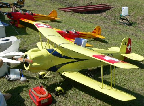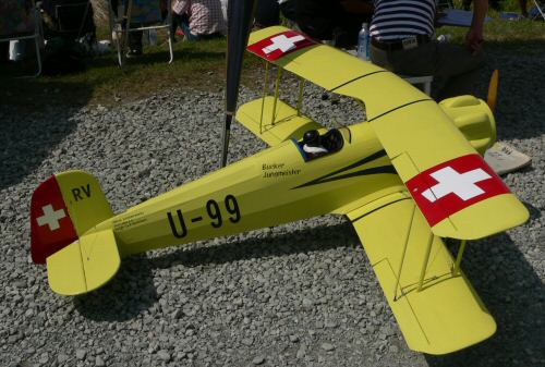 橋本選手のビュッカー ユングマイスターです。OK模型の30年ぐらい前のキットだそうです。クワドラ35cc搭載ですがエンジンが掛からすスライト無しでした。 |