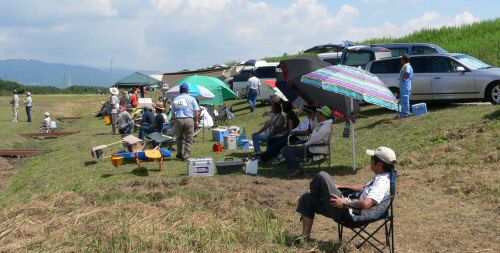 風は弱く暑いぐらいでしたが絶好のスケールフライト日よりでした。日本選手権と名が付くだけに結構な人数が見学に来ていました。車は50台ぐらいいたように思います。 |