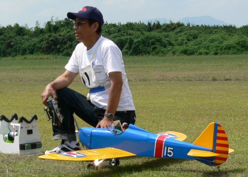 小型機なのにこれ以上ないほど精巧に出来た機体で有名な山下選手です。ラジコン技術誌でも詳しく解説されていましたが凄いです。製作に5年飛ばして6年で100フライと以上とか。脚回りが良く壊れるそうでかなり修理の跡があるそうです。OS−LA15で950g今回は離着陸も2回共決めて3位でした。もし私が金持ちならスポンサーになって大きな零戦を作ってもらいたいです。山下選手の技術があれば素晴らしい物が出来ると信じます。 |