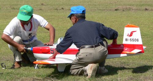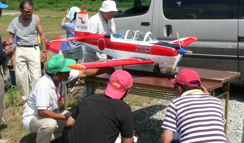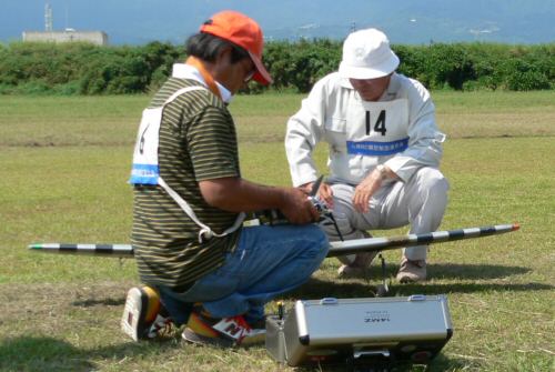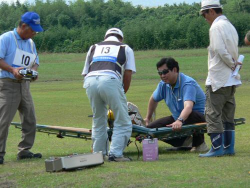 チームスケールに2機出場の門脇選手のピッカースFB5です。OS81α搭載でフライト担当の安藤選手と打ち合わせ中。 |