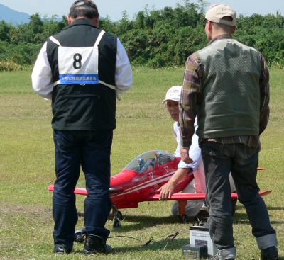 我がクラブの石川選手です。先日はラジコン技術誌の取材もあってやる気機満々です。実機はホームグラウンドの防府北基地に展示してあるT−3です。自衛隊基地ですので普段は遠くから見るだけで基地際の時だけ側に寄って詳しい資料収集が出来ます。 |