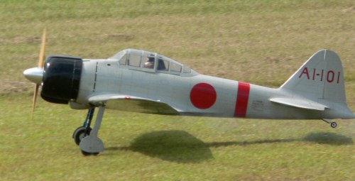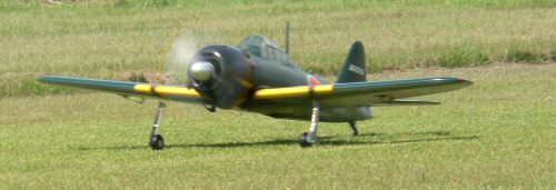 中川選手の零戦52型 ゼノア26cc搭載機の離陸前です。 |