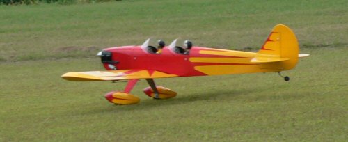 1フライト目はエンジンのマウントが緩んで相当に危険な状態だったそうで、一通りの科目を何とかこなして着陸も決めました。急遽修理をしての2ラウンド目は素晴らしい飛行でした。しかしYSエンジンのパワーは凄いです。12kgといえば100ccクラスのアクロ機ですから。 |