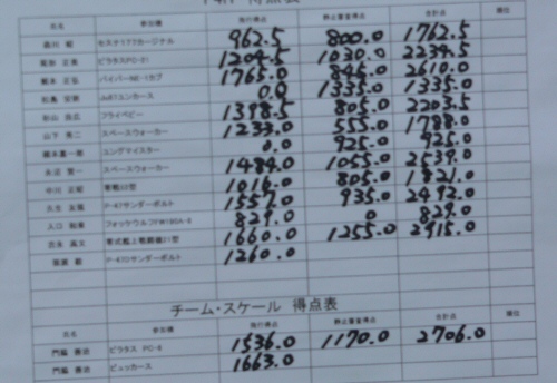 F4Cの結果です。1位は久保脇選手で、2位は石川選手。フライト点は2フライトのどちらか良い方で 2262.0と2101.5静止点は2323.5と2321.0と僅差の勝負でした。 |