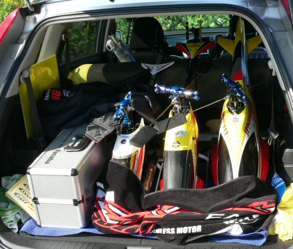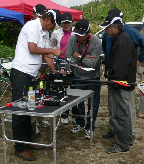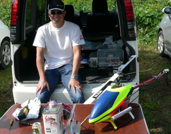 大阪から駆けつけていただいた池田さんの車の中はヘリが3機。すべてヒロボーで、間違ってもJRのヘリは飛ばしません。しかしJRのローターは使ってました、”いいものは使います”だそうです。 |